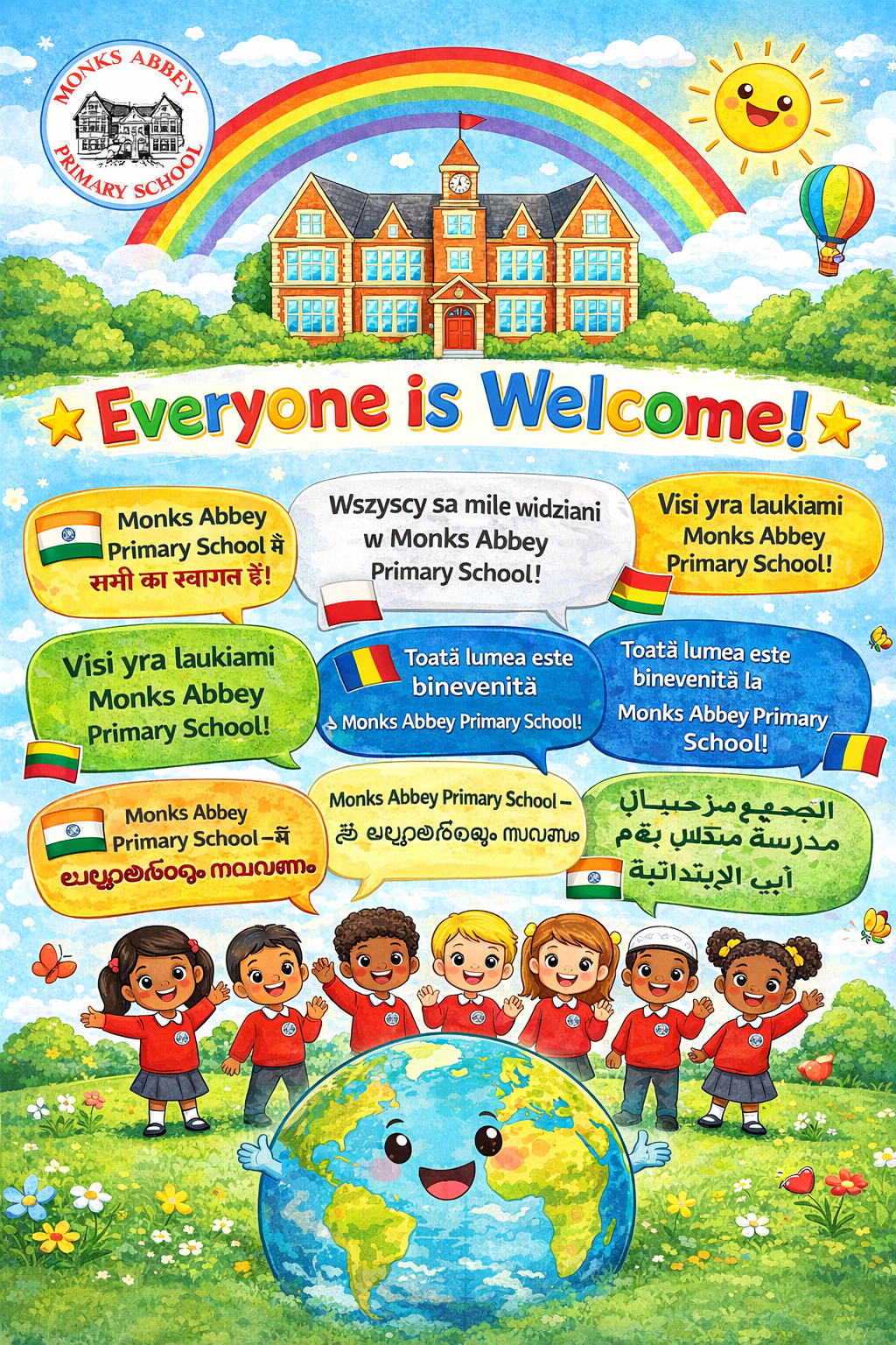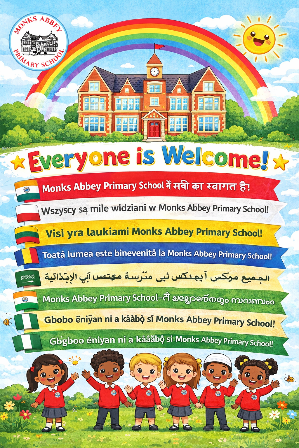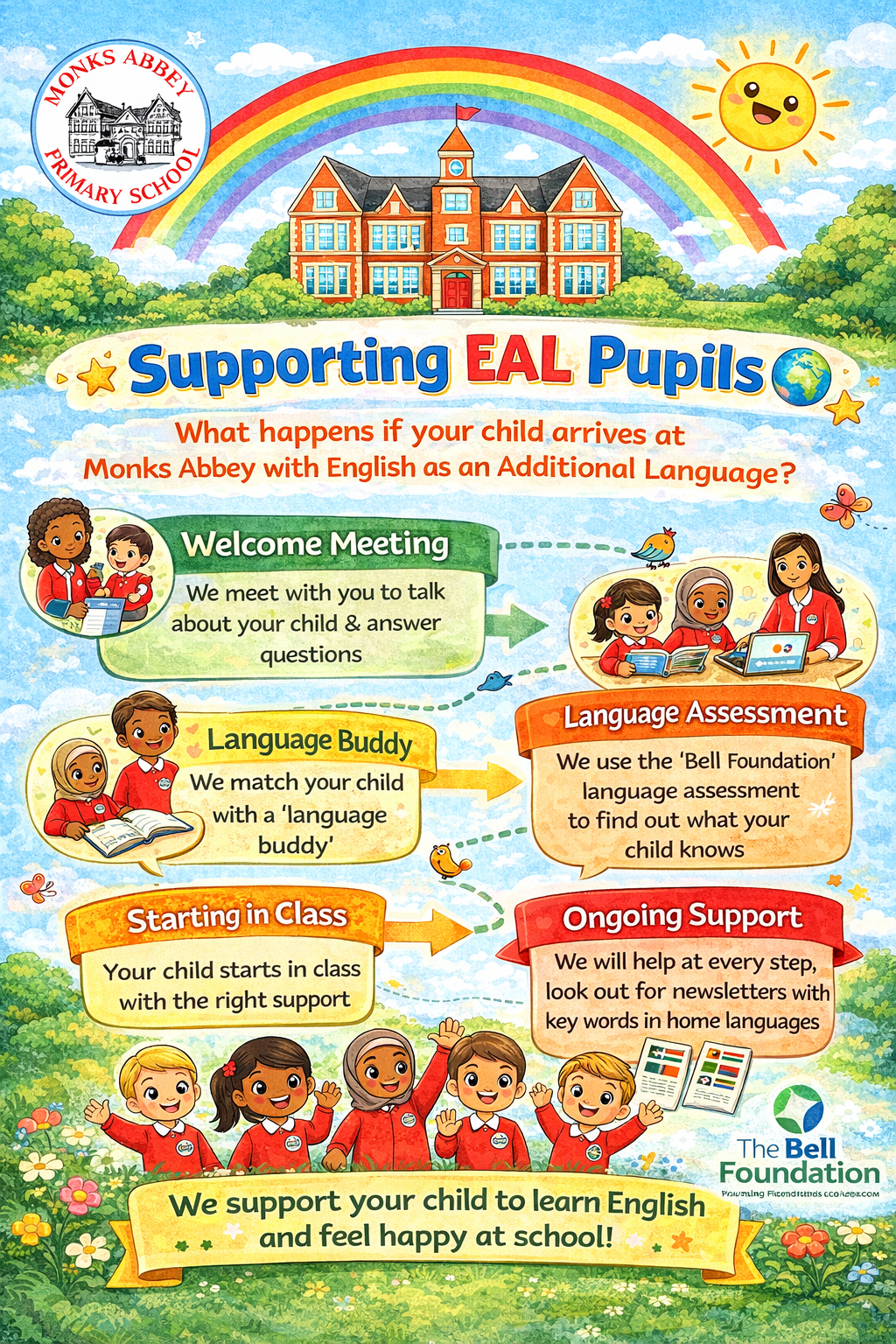 When your child starts at Monks Abbey Primary School, we make sure they feel welcome, safe and well supported from the very beginning. As part of this, we use the Bell Foundation approach, which helps schools understand how children learn English as an Additional Language and ensures they receive the right support to succeed. We will carry out an initial assessment, including checking your child’s foundational knowledge in phonics, writing and maths. Your child will also be supported by a Language Buddy, usually an older child who speaks the same language. We are always happy to translate any information, our termly newsletters will have key curriculum words translated into multiple languages.