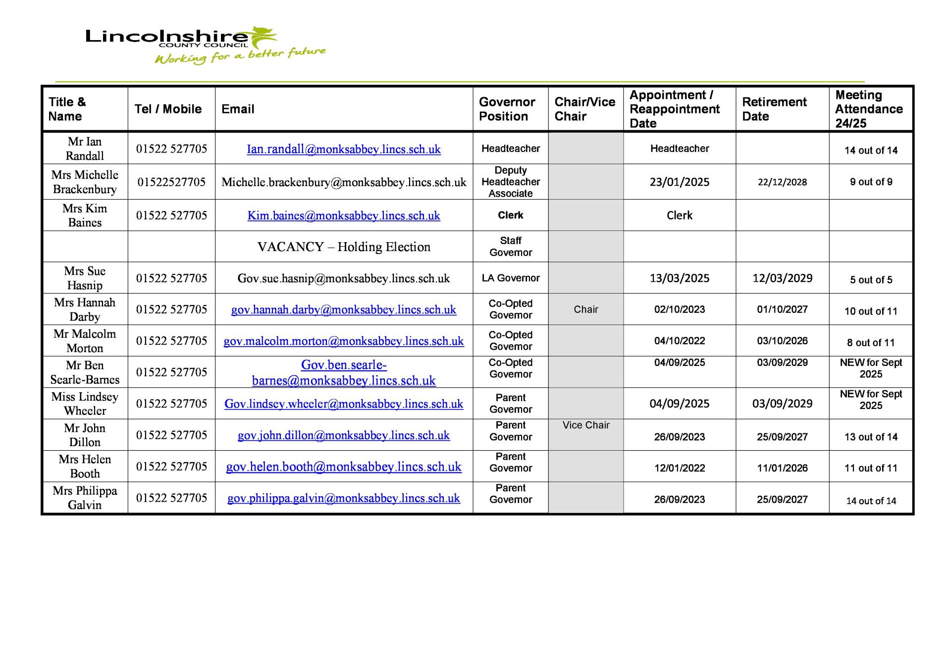 Our Clerk to Governors email address is kim.baines@monksabbey.lincs.sch.uk.